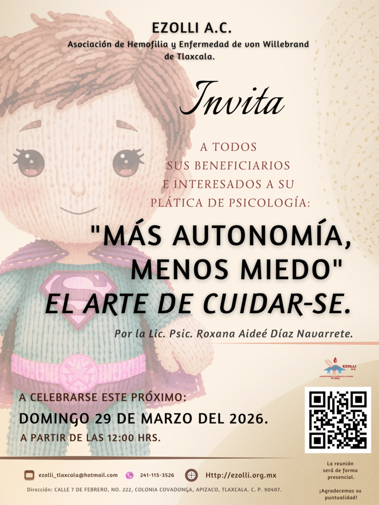 Esta importante plática se llevará a cabo el próximo 29 de marzo a las 12:00 horas y será un espacio de reflexión y aprendizaje dedicado a un tema profundo y fundamental para la vida de las personas que viven con coagulopatías, así como para sus familias y para toda nuestra comunidad.