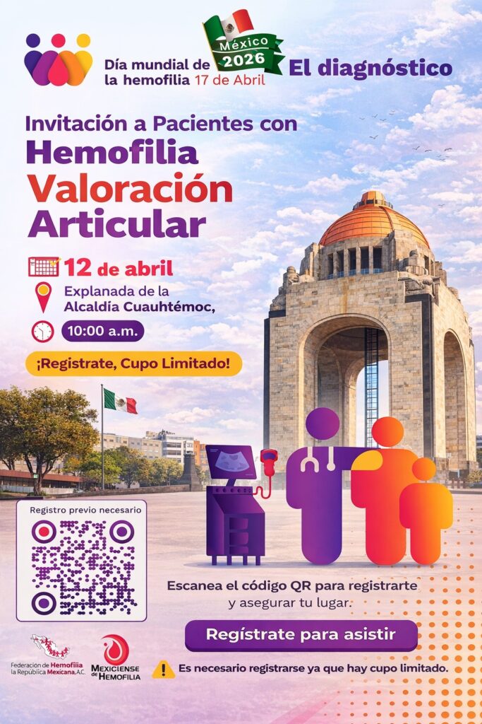 Como parte de las actividades conmemorativas, la Federación de Hemofilia de la República Mexicana invita a pacientes a participar en una jornada de valoraciones articulares especializadas.